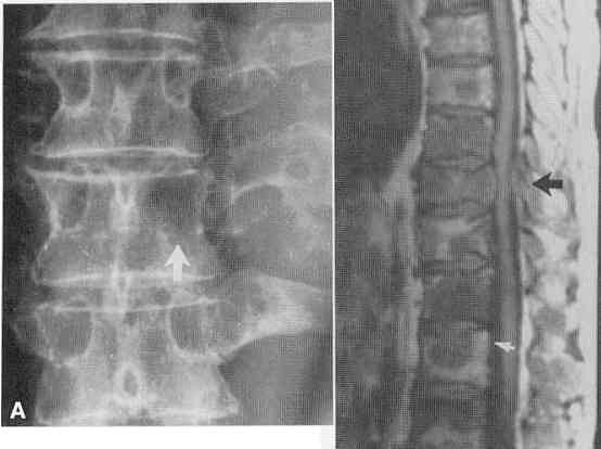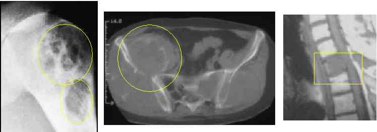 a bone scan or CT are more sensitive than plain Xrays (see right hip met and see rib mets).Advanced spine mets can lead to spinal cord syndrome go here.