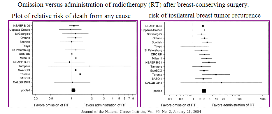 Background: The objective of the study was to investigate whether radiotherapy or its omission after breast-conserving surgery has measurable consequences on local tumor growth and patient survival. Methods: We conducted a pooled analysis of published randomized clinical trials that compared radiotherapy versus no radiotherapy after breast-conserving surgery. The outcomes studied were ipsilateral breast tumor recurrence and patient death from any cause. Results: A search of the literature identified 15 trials with a pooled total of 9422 patients available for analysis. The relative risk of ipsilateral breast tumor recurrence after breast-conserving surgery, comparing patients treated with no radiotherapy or radiotherapy, was 3.00 (95% confidence interval [CI] = 2.65 to 3.40). Mortality data were available for 13 trials with a pooled total of 8206 patients. The relative risk of mortality was 1.086 (95% CI = 1.003 to 1.175), corresponding to an estimated 8.6% (95% CI = 0.3% to 17.5%) relative excess mortality if radiotherapy was omitted. Conclusion: Omission of radiotherapy is associated with a large increase in risk of ipsilateral breast tumor recurrence and with a small increase in the risk of patient mortality. Journal of the National Cancer