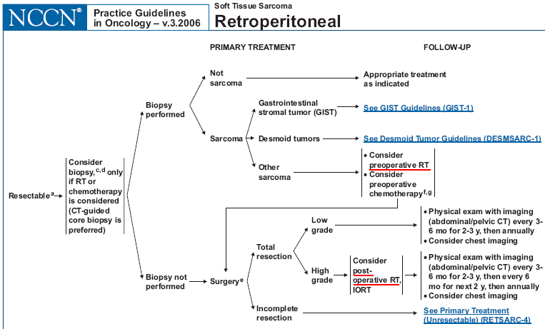 Effective treatment of retroperitoneal sarcomas requires removal of all gross disease while sparing adjacent viscera not invaded by tumor. The prognosis for patients with high-grade retroperitoneal sarcomas is less favorable than for patients with tumors at other sites, partly because of the difficulty in completely resecting these tumors and the limitations placed on high-dose radiation therapy.(see picture) Complete surgical resection is often difficult for sarcomas of the retroperitoneum due to large size before detection and anatomic location. see NCCN guidelines. |
