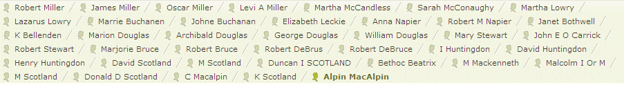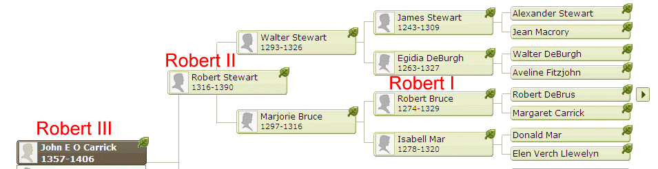 for more info: Robert III, Robert II, Walter Stewart, Marjorie Bruce, James Stewart, Robert I, Robert DeBrus, Margaret Carrick to keep moving back in time push the arrow above or here