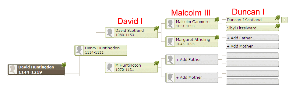 more info: Henry Huntingdon, David I, Malcolm III, Margaret Atheling, Duncan I to keep moving back in time push the arrow above or here