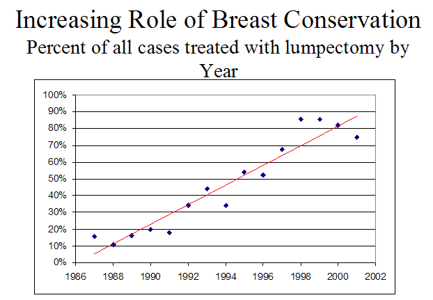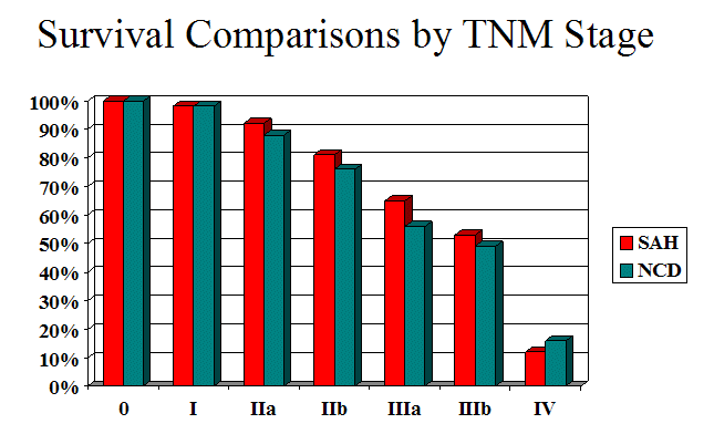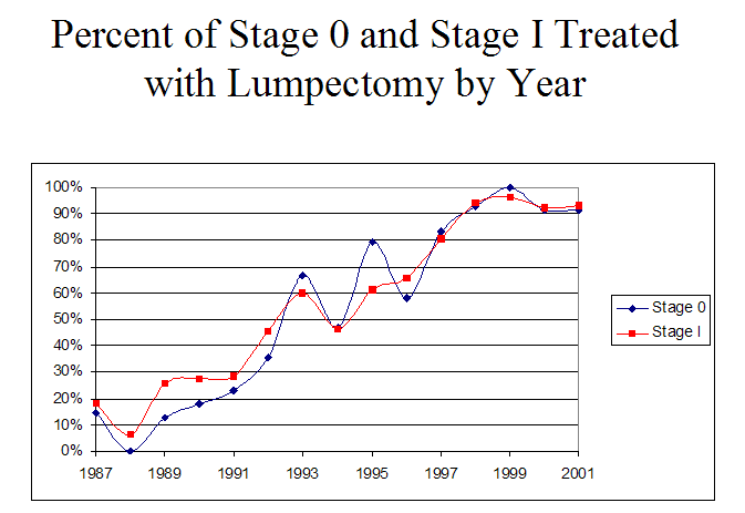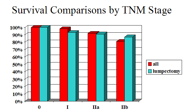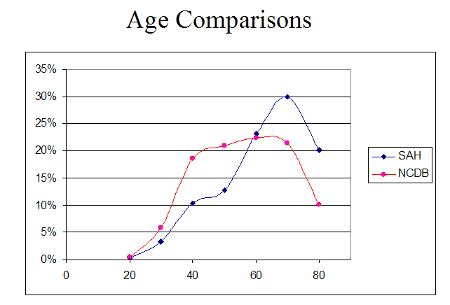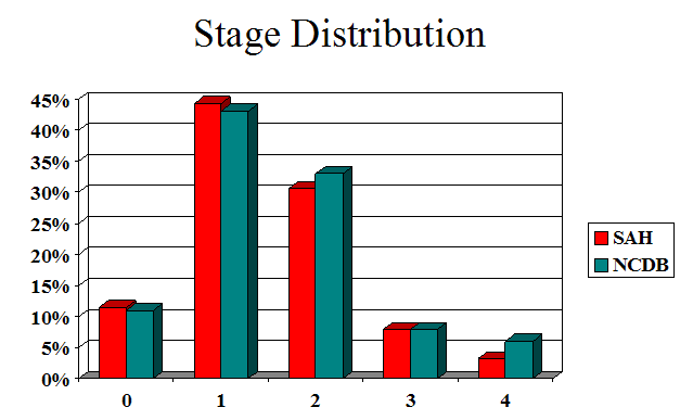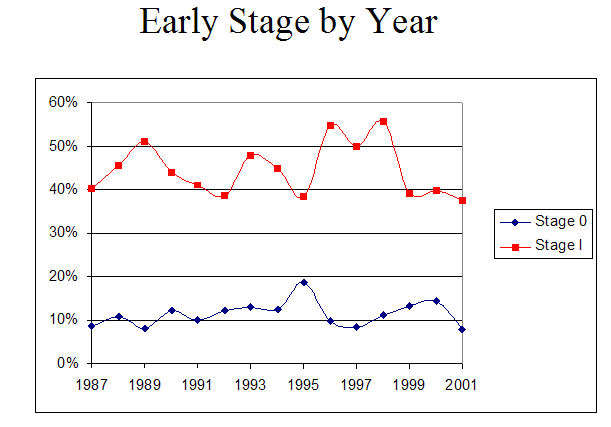 We reviewed all analytic cases of female breast cancer in the St. Anthonys Hospital (SAH) Cancer Registry from 1987 through 2001, and compared the data with the benchmark database, the National Cancer Data Base (NCDB.) There were 1,863 cases with an increasing number of patients seen per year (figure 1). The age distribution (figure 2) shows the SAH patients older than women in the National Cancer Data Base with the most common age group in the 70s. The stage distribution (figure 3) compares favorably with national data with the percent of cases diagnosed in early stages relatively stable (figure 4). Relative survival by stage compares quite well with national data (figure 5). It has been a goal of the Oncology Committee to increase the appropriate use of breast conservation in early stage breast cancer (figure 6). As noted (figure 7) lumpectomy is now clearly the standard of care for women with early stage breast cancer and results in survival identical to patients treated with more extensive surgery (figure 8). In summary, physicians at St. Anthonys hospital have been caring for an increasing number of women with breast cancer over the last 15 years. There has been a dramatic increase in the use of breast conservation with excellent survival rates that equal or surpass national standards. |