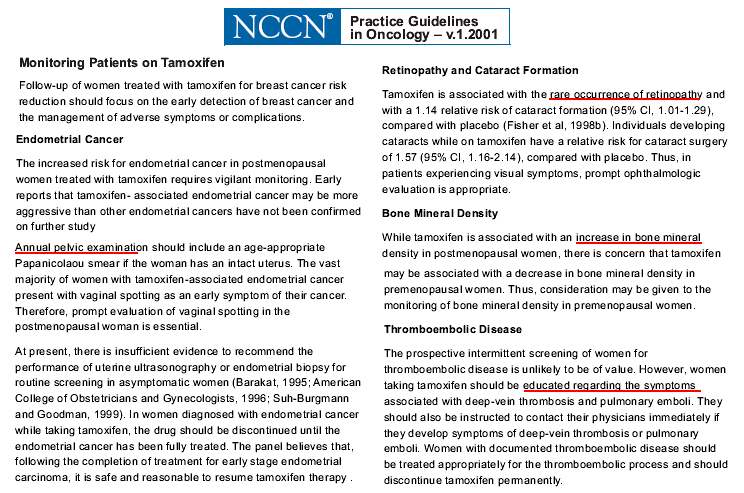 Monitoring Patients on Tamoxifen NCCN 2005 Endometrial Cancer The increased risk for endometrial cancer in postmenopausal women treated with tamoxifen requires monitoring. Early reports that tamoxifen-associated endometrial cancer may be more aggressive than other endometrial cancers have not been confirmed on further study. In the NSABP Breast Cancer Prevention Trial, the only death from endometrial cancer occurred in a placebo-treated subject. Recent analysis from the NSABP data has noted a small number of uterine sarcomas among the number of patients taking tamoxifen with an intact uterus. These patients have already been included in the reported number of patients diagnosed with endometrial cancer. Overall, the rate of sarcoma in women taking tamoxifen was 0.17 per 1,000 women years. This translates to less than one-tenth of 1%. a new “black box” Food and Drug Administration warning on tamoxifen has been added to highlight the uterine cancer risk (both endometrial and uterine sarcoma) and will also include pulmonary embolism and stroke risks. Annual pelvic examination should include an age-appropriate Papanicolaou smear if the woman has an intact uterus. The vast majority of women with tamoxifen-associated endometrial cancer present with vaginal spotting as an early symptom of cancer. Therefore, prompt evaluation of vaginal spotting in the postmenopausal woman is essential. At present, there is insufficient evidence to recommend the performance of uterine ultrasonography or endometrial biopsy for routine screening in asymptomatic women. In women diagnosed with endometrial cancer while taking tamoxifen, the drug should be discontinued until the endometrial cancer has been fully treated. The panel believes that it is safe and reasonable to resume tamoxifen therapy after completion of treatment for early stage endometrial carcinoma. Retinopathy and Cataract Formation Tamoxifen is associated with the rare occurrence of retinopathy and with a 1.14 relative risk of cataract formation, compared with placebo. Individuals developing cataracts while on tamoxifen have a relative risk for cataract surgery of 1.57, compared with placebo. Thus, in patients experiencing visual symptoms, prompt ophthalmologic evaluation is appropriate. Bone Mineral Density Although tamoxifen is associated with an increase in bone mineral density in postmenopausal women, there is concern that it may be associated with a decrease in bone mineral density in premenopausal women. Thus, monitoring bone mineral density in premenopausal women may be considered. Thromboembolic Disease The prospective intermittent screening of women for thromboembolic disease is unlikely to be of value. However, women taking tamoxifen should be educated regarding the symptoms associated with deep vein thrombosis and pulmonary emboli. They should also be instructed to contact their physicians immediately if they develop symptoms of deep vein thrombosis or pulmonary emboli. Women with documented thromboembolic disease should be treated appropriately for the thromboembolic process and should discontinue tamoxifen permanently. |