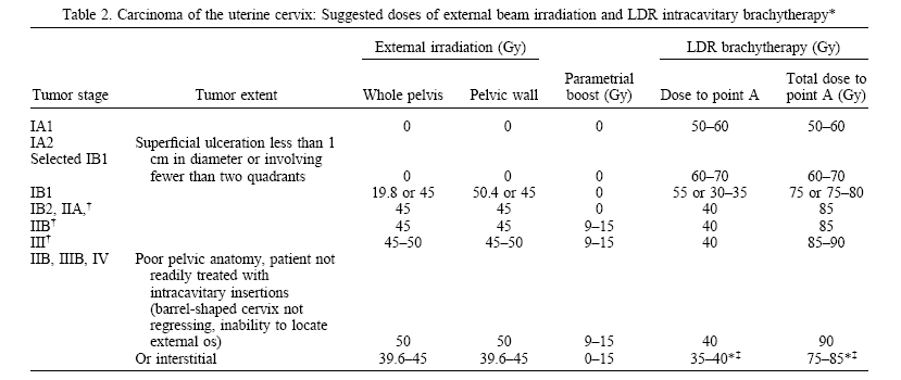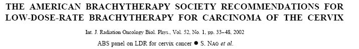The ABS recommends completion of treatment within 8 weeks, when possible. Prolonging total treatment duration can adversely affect local control and survival. Recommendations are made for definitive and postoperative therapy after hysterectomy. Although recognizing that many efficacious LDR dose schedules exist, the ABS presents suggested dose and fractionation schemes for combining external beam radiotherapy with LDR brachytherapy for each stage of disease. The dose prescription point (point A) is defined for intracavitary insertions. Dose rates of 0.50 to 0.65 Gy/h are suggested for intracavitary brachytherapy. Dose rates of 0.50 to 0.70 Gy/h to the periphery of the implant are suggested for interstitial implant. Use of differential source activity or loading minimizes excessive central dose rates. The dose to the nominal rectal and bladder points should be kept as low as possible, although consistent with delivering appropriate tumor doses. Every effort should be made to keep the bladder dose to <90% of point A dose, the total bladder dose below 80 Gy, and the total rectal dose below 75 Gy