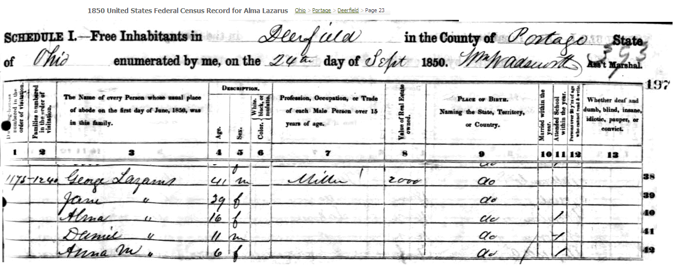 Alma Lazarus was born in North Benton, Ohio on September 14, 1834. She attended
