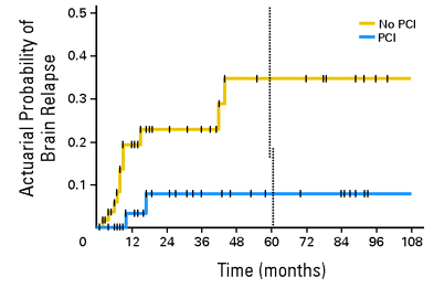 Patients and Methods: After mediastinoscopic staging, patients with operable stage IIIA NSCLC were enrolled to a German multicenter trial and randomly assigned to receive either primary resection followed by adjuvant thoracic radiation therapy (50 to 60 Gy; arm A) or preoperative chemotherapy (cisplatin/etoposide [PE]; three cycles) followed by concurrent chemoradiotherapy (PE plus 45 Gy; 1.5 Gy twice per day) and definitive surgery (arm B), respectively. Patients in arm B were scheduled to receive PCI (30 Gy; 2 Gy daily fractions). Results: One hundred twelve patients were randomly assigned between November 1994 and July 2001. One hundred six patients were eligible (arm A: 51, arm B: 55), 90 males and 16 females, 50 with squamous cell, 16 with large cell, five with adenosquamous, and 35 with adenocarcenoma (median age, 57 years; range, 37 to 71 years). Forty-three patients received PCI as scheduled in arm B. Eleven long-term survivors (arm A: four; arm B: seven) underwent a comprehensive neuropsychological examination. PCI significantly reduced the probability of brain metastases as first site of failure (7.8% at 5 years v 34.7%), the overall brain relapse rate was reduced comparably (9.1% at 5 years v 27.2%). A slightly reduced neurocognitive performance in comparison with the age-matched normal population was found for patients in both treatment groups. No significant difference between patients who were treated with or without PCI could be noted. Conclusion: PCI is effective in preventing brain metastases following this aggressive trimodality approach. Neurocognitive late effects are not significantly different between patients treated with or without PCI. |