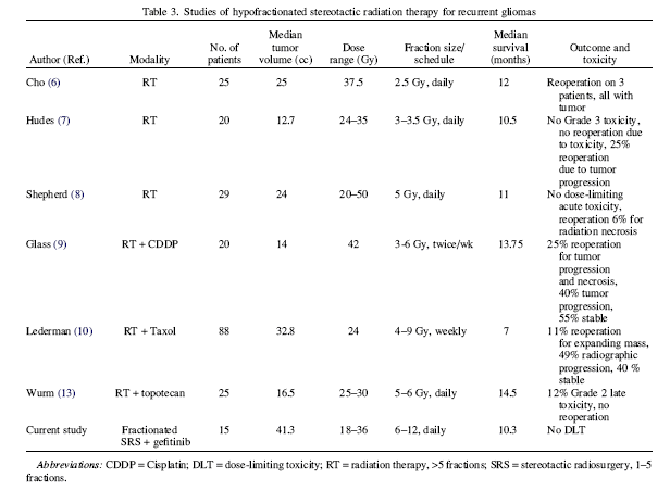 DiscussionResults of this study indicate that a total SRS dose of 36 Gy in three fractions may be safely administered in combination with gefitinib, at a dose of 250 mg per day, to patients with a recurrent malignant glioma after initial RT (54–61.2 Gy) and chemotherapy. To our knowledge, this study represents the first formal prospective trial in which SRS has been combined with an EGFR-TKI. There is ongoing debate about whether the linear quadratic model can be accurately applied to model the biological effect of single fraction doses in the range typically applied for single-fraction SRS and the multiple-fraction SRS used in this study. Regarding this, Guerrero and Li suggested accommodation for the expected intrafractional repair during an individual high-dose treatment by the use of the Curtis lethal–potentially lethal formalism. Thus it is difficult to compare the relative biological potency of the doses used in our study with the single fraction SRS doses established as safe in the RTOG 90-05 Phase I study. In that particular study, which included both previously irradiated primary brain tumors (median prior radiation dose, 60 Gy) and brain metastases (median prior dose, 30 Gy), the MTD for recurrent tumors of maximum diameters ≤2 cm, 2.1–3 cm, and 3.1–4 cm were 24 Gy, 18 Gy, and 15 Gy, respectively. The biologic equivalent dose (BED) of the highest of these doses (24 Gy in a single fraction), assuming an α/β of 10 Gy for tumor tissue and applying the standard BED equation would be 82 Gy-10. The BED of 36 Gy in three fractions, determined with the same assumptions, would be 79.2 Gy. Besides the fact that the linear quadratic–based BED does not account for the mitigating effect of intrafractional repair, there is also the problem of reconciling differences in dose inhomogeneity within the target volume, which are not fully represented by the simple expression of prescription dose to the periphery of the PTV. Yet another difference between our study and the RTOG 90-05 study is the volume of tumors treated. Specifically, here, tumors up to 6 cm in maximum diameter were allowed, whereas the RTOG 90-05 study limited the maximum tumor dimension to 4 cm. Volumetric data about the PTV were not included in the RTOG 90-05 report, and therefore additional comparison between the volumes of tumors treated on the current study and the RTOG 90-05 study is not possible. In the last decade, several groups had reported their data on FSRT in patients with recurrent malignant gliomas who received prior radiation to a median dose around 60 Gy. Those studies were mostly retrospective in nature, and the RT doses and fractionation schemes vary significantly (the RT doses ranged from 24 Gy to 50 Gy, and fraction size from 2.5–10 Gy). The median tumor volumes treated were in the range of 12.7 cc to 33 cc. Across those various fractionation and dose schemes, the treatment regimens were reportedly well tolerated, with reoperation rates between 0% and 25%. The median survivals were reported to be in the range of 7 to 14.5 months. Compared with those reported regimens, the 36 Gy in three fractions in our dose-escalation study represents the highest fraction size patients have been treated with to date. In addition, the median tumor volume treated in this study (41.3 cc) is larger than the median tumor volume in the other studies. Despite these facts, the median survival in our study patients was 10 months, which was compatible with those outcomes previously reported. Of course, interstudy comparisons are always difficult because differences in patient selection criteria are applied in different centers. As noted earlier, two patients had a surgical resection of lesions that had enlarged following SRS, and in both cases, histopathology revealed extensive radionecrosis without tumor recurrence. Following these observations, later patients who had asymptomatic progression on MRI by conventional criteria were managed more conservatively. Gefitinib was continued unless there was intolerance to the agent or clinical deterioration. It should be noted that the RTOG central nervous system (CNS) toxicity criteria define clinically or radiographically suspected radionecrosis and histologically proved radionecrosis at the time of an operation as Grade 4 toxicity, whereas the CTC version 3 defines asymptomatic CNS necrosis with only radiographic findings as Grade 1 toxicity. Grade 2 CNS necrosis is defined as symptomatic but not interfering with active daily life (ADL). Grade 3 CNS necrosis is symptomatic and interferes with ADL. Grade 4 CNS necrosis is defined as life-threatening and requires operative intervention. In this study, two patients with pathologically proven necrosis were asymptomatic and therefore designated Grade 1. There is a clear need to improve local tumor control in high-grade gliomas because most patients die from progressive disease at or in close proximity to the primary site. To achieve local control, radiotherapy must be aggressive enough to kill the recurrent tumor, and there will likely be an unavoidable risk of tissue radionecrosis. Because of the poor prognosis of patients with recurrent high-grade gliomas, it is our opinion that asymptomatic radionecrosis should be an acceptable effect and thus not defined as a dose-limiting toxicity. Radionecrosis becomes an unacceptable consequence of radiotherapy only when it causes permanent neurologic deficit and adversely affects function and quality of life. Others have also noted that conventional MR imaging findings are frequently inadequate for reliably distinguishing radiation necrosis from tumor recurrence in patients with gliomas. Functional imaging can sometimes allow better distinction of recurrent tumor from radiation effects (30), although biopsy or surgical resection is still the gold standard for a definitive diagnosis Although the test has acknowledged limitations, the MMSE is at least somewhat useful to monitor cognitive fu