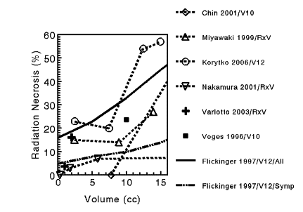 volume receiving 12 Gy; RxV = treatment volume. Flickinger data is