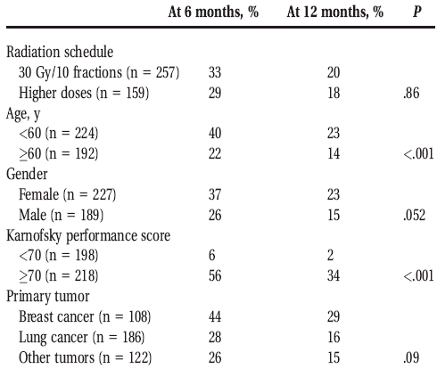 diagnosis and RT, number of metastases, extracranial metastases, and