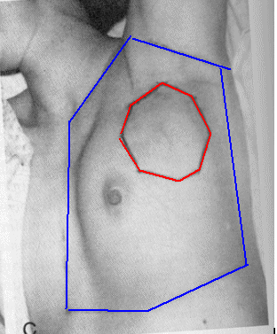 the areas that are to be treated with radiation are marked on the skin and may include not just the breast but the lymph node areas that surround the breast |