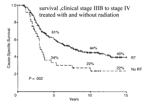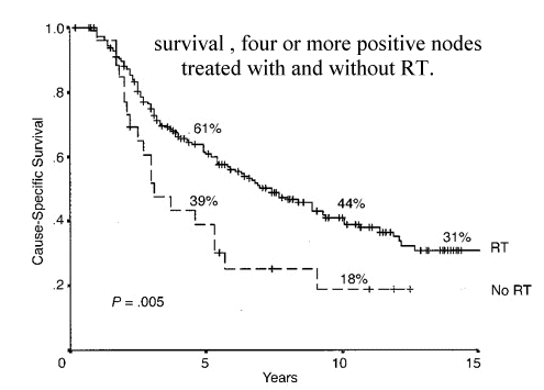 CONCLUSION: After neoadjuvant chemotherapy and mastectomy, comprehensive radiation was found to benefit both local control and survival for patients presenting with clinical T3 tumors or stage III-IV (ipsilateral supraclavicular nodal) disease and for patients with four or more positive nodes. Radiation should be considered for these patients regardless of their response to initial chemotherapy. |