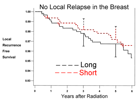 Results: From April 1993 through September 1996, 1234 women were randomly assigned to treatment, 622 to the short arm and 612 to the long arm. Median follow-up was 69 months. Five-year local recurrence-free survival was 97.2% in the short arm and 96.8% in the long arm (absolute difference = 0.4%, 95% confidence interval [CI] = –1.5% to 2.4%). No difference in disease-free or overall survival rates was detected between study arms. The percentage of patients with an excellent or good global cosmetic outcome at 3 years was 76.8% in the short arm and 77.0% in the long arm; the corresponding data at 5 years were 76.8% and 77.4%, respectively (absolute difference = –0.6%, 95% CI = –6.5% to 5.5%). Conclusion: The more convenient 22-day fractionation schedule appears to be an acceptable alternative to the 35-day schedule.