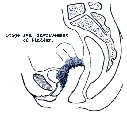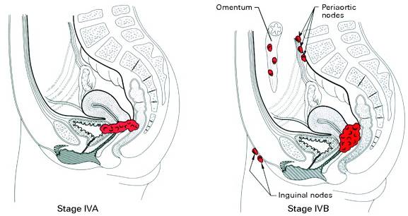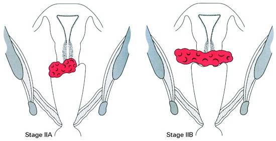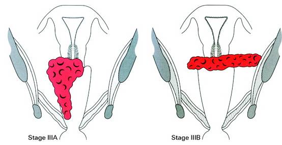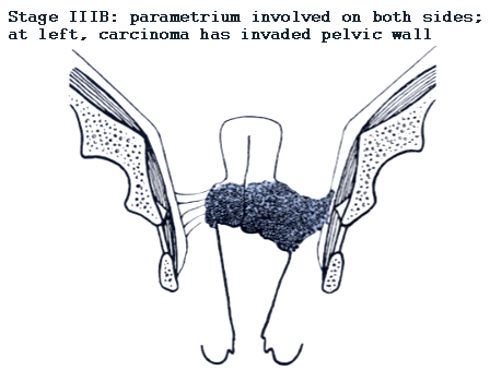 | Stage I Stage I is carcinoma strictly confined to the cervix; extension to the uterine corpus should be disregarded. Stage IA: Invasive cancer identified only microscopically. All gross lesions even with superficial invasion are stage Ib cancers. Invasion is limited to measured stromal invasion with a maximum depth of 5 mm* and no wider than 7 mm. Stage IA1: Measured invasion of the stroma no greater than 3 mm in depth and no wider than 7 mm diameter. Stage IA2: Measured invasion of stroma greater than 3 mm but no greater than 5 mm in depth and no wider than 7 mm in diameter. Stage IB: Clinical lesions confined to the cervix or preclinical lesions greater than stage IA. Stage IB1: Clinical lesions no greater than 4 cm in size. Stage IB2: Clinical lesions greater than 4 cm in size. Stage II Stage II is carcinoma that extends beyond the cervix but has not extended onto the pelvic wall. The carcinoma involves the vagina, but not as far as the lower third. Stage IIA: No obvious parametrial involvement. Involvement of up to the upper two-thirds of the vagina. Stage IIB: Obvious parametrial involvement, but not onto the pelvic sidewall. Stage III Stage III is carcinoma that has extended onto the pelvic sidewall. On rectal examination, there is no cancer free space between the tumor and the pelvic sidewall. The tumor involves the lower third of the vagina. All cases with a hydronephrosis or nonfunctioning kidney should be included, unless they are known to be due to other causes. Stage IIIA: No extension onto the pelvic sidewall but involvement of the lower third of the vagina. Stage IIIB: Extension onto the pelvic sidewall or hydronephrosis or nonfunctioning kidney. Stage IV Stage IV is carcinoma that has extended beyond the true pelvis or has clinically involved the mucosa of the bladder and/or rectum. Stage IVA: Spread of the tumor onto adjacent pelvic organs. Stage IVB: Spread to distant organs. * The depth of invasion should not be more than 5 mm taken from the base of the epithelium, either surface or glandular, from which it originates. Vascular space involvement, either venous or lymphatic, should not alter the staging.