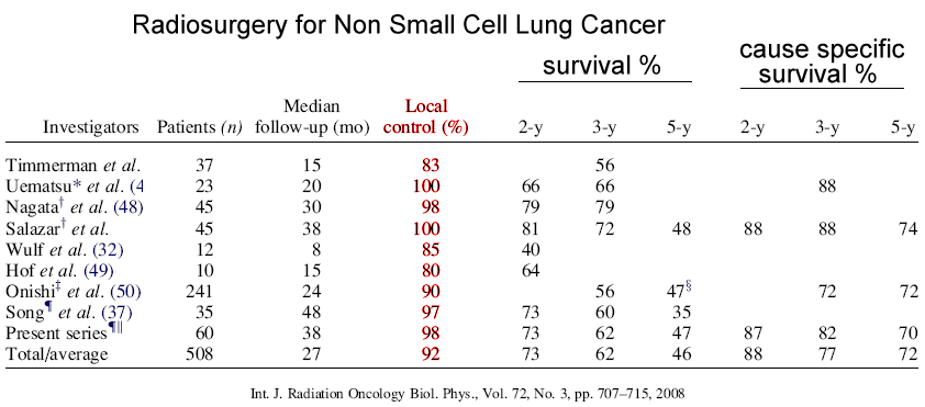 actuarial local control rate was 92% for lung cancer patients and 80% for metastasis