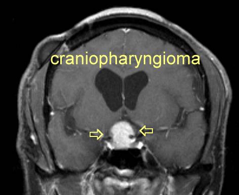 Craniopharyngiomas can also cause more generalized symptoms, such as depression, independent of any hormone deficiency . The presumed cause is extension of tumor into the frontal lobes, striocapsulothalamic areas, or limbic system. These tumors invade the third ventricle more often than pituitary adenomas, sometimes causing obstruction to flow of spinal fluid and increased intracranial pressure with corresponding symptoms and signs. (See "Evaluation and management of elevated intracranial pressure in adults"). DIAGNOSIS Preoperatively, the diagnosis of craniopharyngiomas is usually suggested from computed tomographic (CT) or magnetic resonance (MR) imaging. Craniopharyngiomas must be distinguished from other tumors in the parasellar area, including meningiomas, optic gliomas, teratomas, systemic histiocytosis, metastases, and infiltrative disorders such as sarcoidosis. Calcification in the suprasellar region is seen in about 80 percent of patients with craniopharyngioma and at least one cyst in 75 percent. Thus, a cystic calcified parasellar lesion is very likely to be a craniopharyngioma. MR imaging of the sellar region, including at least one contrast�enhanced sequence, should be sufficient in most instances to establish a preoperative diagnosis. Calcifications can also be seen on plain skull radiographs The distinction between craniopharyngioma and other tumors may be difficult both on clinical and radiographic grounds. The radiographic difficulty arises from the absence of clear delineation between the tumor and optic chiasm. The presence of edema spreading along the optic tract may be an indicator of craniopharyngioma. In one series, this pattern of edema was seen in five of eight consecutive patients with craniopharyngioma but in none of 15 patients with large pituitary adenomas compressing the optic chiasm or none of six patients with meningiomas of the sellar region . It is also useful to distinguish nonneoplastic cystic lesions such as Rathke's cleft cyst and arachnoid cyst from craniopharyngioma, because the type and aggressiveness of treatment, recurrence rate, and prognosis of these lesions vary. In a study of 52 patients, short-term memory loss and calcifications on MR imaging were more suggestive of a craniopharyngioma than a Rathke's cleft cyst or arachnoid cyst . Since most patients with craniopharyngioma have at least partial hypopituitarism, endocrine testing, particularly of adrenal and thyroid function, is indicated before surgery. (See "Diagnosis of hypopituitarism" and see "Diagnosis of adrenal insufficiency"). A detailed ophthalmologic examination including visual field testing helps to determine whether there is compression of the optic pathways and establishes a presurgical baseline. In some patients, the onset of symptoms is late and no calcification is seen on radiologic testing. In these patients, the diagnosis can only be established histologically. TREATMENT Therapeutic options for patients with craniopharyngioma include surgery, radiotherapy, and the combination of the two. Radiotherapy alone is usually restricted to patients with very small tumors, while the optimum extent of surgery remains controversial. In addition, several methods can be used to treat symptoms associated with cyst enlargement. After attempting surgical excision, Cushing concluded that surgical mortality would remain unacceptable until the multilocular epithelial cysts could be destroyed or inactivated. Total surgical excision became possible after the development of microsurgical techniques , and with use of these techniques recovery of some visual function occurs in almost 90 percent of symptomatic patients and complete recovery in up to one-third . However, continued experience has dampened the enthusiasm for extensive surgery for the following reasons: