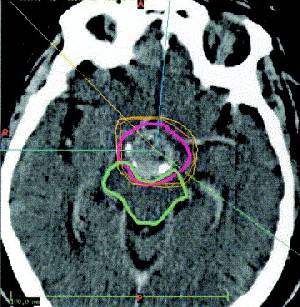 Several authors recommend radical subtotal resection and irradiation as an acceptable alternative to total resection . However, others advocate a more conservative (less radical) surgical approach, based upon the risks of aggressive surgery and the efficacy of radiation in this setting . Although patients can often compensate for neurologic and endocrine deficits, psychosocial deficits associated with radical surgery are now recognized as a major factor limiting the quality of life as young patients grow into adulthood . Thus, surgical hypothalamic injury should be minimized. To accomplish successful treatment without serious deficits, some have advocated an approach consisting of removal of no more tumor than is considered safe (ie, less than a radical subtotal resection), followed by postoperative irradiation. Patients may deteriorate acutely during radiotherapy; this is usually due to either cystic enlargement or hydrocephalus rather than tumor progression. If recognized early and appropriate surgical therapy is administered, radiation therapy can be completed with a good outcome . Radiation dosing Doses above 54 to 55 Gy provide a significantly greater likelihood of local tumor control . In a retrospective series, the recurrence rate was significantly higher in patients receiving <54 Gy compared with higher doses (50 versus 15 percent) . The incidence of radiation-induced endocrine, neurologic, and vascular sequelae is low unless doses above 61 Gy are administered . Another concern is the potential for late secondary malignant brain tumors in patients who have received cranial irradiation . Among eight patients who received radiotherapy for craniopharyngioma who developed gliomas, the mean radiation dose was 58 Gy and the mean latent period was 11.5 years . Cyst management Several other approaches are also useful in managing patients with craniopharyngioma initially or, more commonly, at the time of recurrence. Since recurrent symptoms are usually due to reaccumulation of cyst fluid, the following treatments can decrease cyst size: intermittent aspiration by stereotaxic puncture or placement of an Ommaya reservoir; sclerosis of the cyst wall by chemotherapeutic drugs; and internal irradiation with radioisotopes. Cyst aspiration Percutaneous aspiration of cyst contents has been used to alleviate symptoms, and intermittent aspiration may be recommended whenever total excision seems ill-advised. An alternative is placement of an Ommaya reservoir system for intermittent aspiration of cysts that cannot be completely resected. Intralesional therapy When repeated cyst aspirations are deemed inadvisable, intralesional radiotherapy or chemotherapy can be utilized. One case report described minimal excision plus intermittent intralesional bleomycin through an Ommaya reservoir in a child with a gigantic cystic craniopharyngioma . An alternative in patients with solitary or multicystic tumors is intracavitary irradiation via stereotactically applied radioisotopes . Beta-emitting isotopes such at 90Yt (yttrium-90), 186Rh (rhenium-196), and 32P are preferred because of the limited penetrance of the emitted energy and the relative ease of handling. The reported results are similar to those with microsurgery: