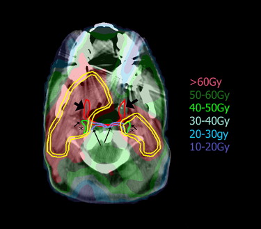 In conclusion, this study has demonstrated that IMRT aiming at sparing the swallowing structures is feasible. Significant relationships were found between dose–volume parameters for these structures and objective and subjective measures of swallowing dysfunction and dysphagia. These relationships can now serve to define optimization goals, and they motivate efforts to reduce these doses as much as possible. Longer follow-up is clearly necessary. Most importantly, care in the outlining of targets in the vicinity of these structures, avoiding target underdosing, and determining and reporting the locations of locoregional recurrences, are essential to ensure that the rates of local recurrences do not increase compared with the rates observed previously after IMRT.