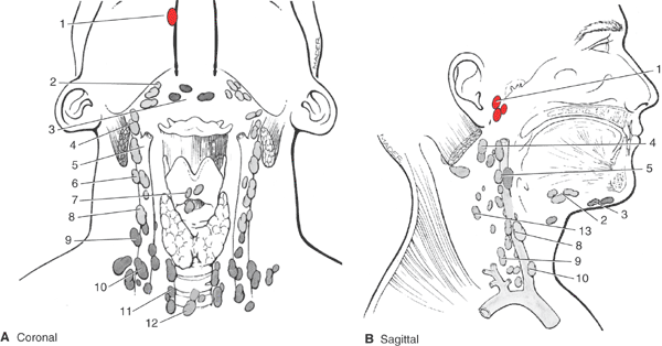 ParaNasal Ethmoid. The red node highlights the sentinel node, which is the highest retropharyngeal node. A. Coronal. B. Sagittal. Once the sentinel node is involved, all of the neck nodes are at risk for metastases. The regional nodes include: (1) retropharyngeal; (2) submandibular; (3) submental; (4) superior deep cervical; (5) jugulodigastric; and (6) midjugular. The juxtaregional nodes are: (7) prelaryngeal; (8) jugulo-omohyoid; (9) inferior deep cervical; (10) supraclavicular; (11) paratracheal; (12) pretracheal; and (13) spinal accessory. |
