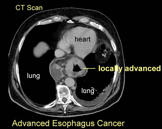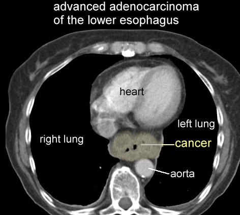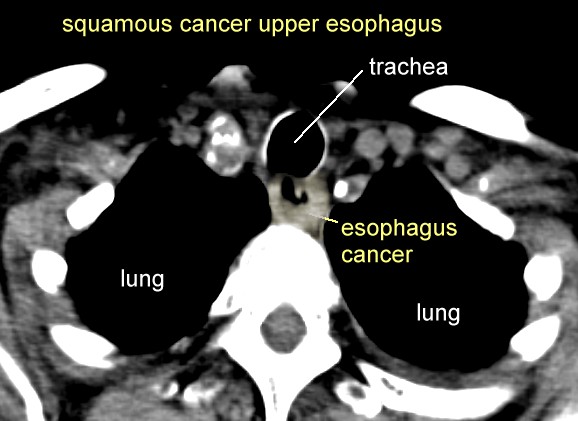Images of Esophagus Cancer CT Scans show the anatomy quite well (compare normal CT scans here with typical esophagus cancer here and other pictures below). |