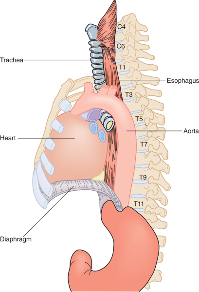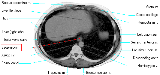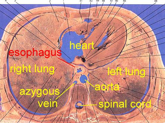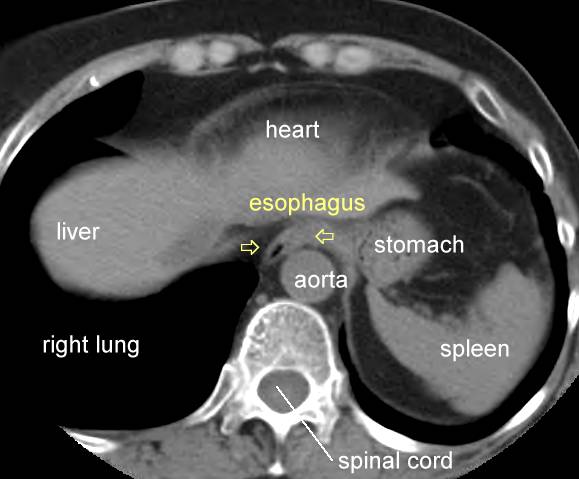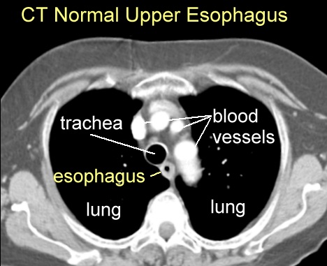 The oldest test was a barium swallow or upper GI exam. Also useful is a CT scan (CT #2) , and normal CT#3, and CT#4, through the chest and cross sectional anatomy here and here.