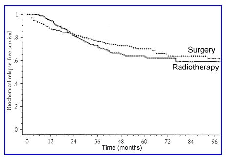 same institution with either radical prostatectomy or RT achieved similar 7-year rates of