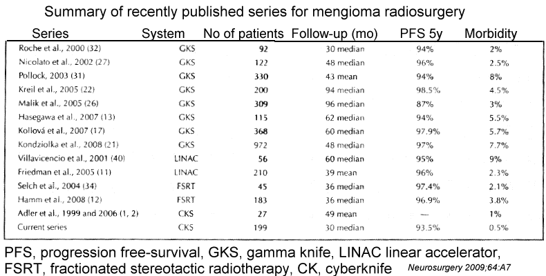 intracranial meningiomas. Lee JY,Prog Neurol Surg. 2007;20:142-9 Department of Neurological Surgery, University of Pittsburg Between September 1987 and December 2004, 964 patients underwent Gamma Knife radiosurgery at the University of Pittsburgh for the diagnosis of meningioma. The majority of patients had tumors located at the skull base. All imaging and clinical follow-up was reviewed. Results: Overall, Gamma Knife radiosurgery provides 5- and 10-year actuarial tumor control rates of 93% for benign meningiomas. The 5-year actuarial control rate for patients with atypical and malignant meningiomas was 83 +/- 7 and 72 +/- 10%, respectively. The incidence of adverse radiation effect ranged from 5.7 to 16%; however, the incidence was gradually reduced with the advent of magnetic resonance imaging and lower dosing since 1991. Conclusion: Gamma Knife radiosurgery is an attractive option for patients with intracranial meningiomas. It can be used as both primary treatment based on imaging diagnosis alone, or as an adjunct treatment after craniotomy. It provides long-term tumor control with minimal adverse sequelae. Long-term outcomes after meningioma radiosurgery: physician and patient perspectives. Kondziolka D, Levy EI, Niranjan A, Flickinger JC, Lunsford LD. J Neurosurg 1999 Jul;91(1):44-50. Department of Neurological Surgery, University of Pittsburgh, Pennsylvania The authors evaluated 99 consecutive patients who underwent radiosurgery for meningioma between 1987 and 1992. The average tumor margin dose was 16 Gy and the median tumor volume was 4.7 ml (range 0.24-24 ml). Fifty-seven patients (57%) had undergone prior resection, of which 12 procedures were considered "total." Five patients received fractionated radiation therapy before radiosurgery. Eighty-nine patients (89%) had skull base tumors. The clinical tumor control rate (no resection required) was 93%. Sixty-one (63%) of 97 tumors became smaller, 31 (32%) remained unchanged in size, and five (5%) were enlarged. Resection was performed in seven patients (7%), six of whom had undergone prior resection. New neurological deficits developed in five patients (5%) 3 to 31 months after radiosurgery. Twenty-seven (42%) of 65 responding patients were employed at the time of radiosurgery and 20 (74%) of these remained so. Radiosurgery was believed to have been "successful" by 67 of 70 patients who completed an outcomes questionnaire 5 to 10 years later. At least one complication was described by nine patients (14%) and in four patients the complications resolved. CONCLUSIONS: Five to 10 years after radiosurgery, 96% of surveyed patients believed that radiosurgery provided a satisfactory outcome for their meningioma. Overall, 93% of patients required no other tumor surgery. Incidences of morbidity in this early experience were usually transitory and relatively mild. Radiosurgery provided long-term tumor control associated with high rates of neurological function preservation and patient satisfaction. |