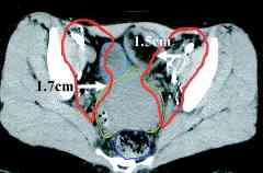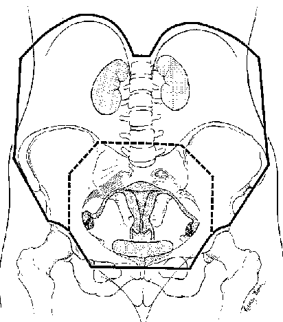 Lateral Portals: Superior/Inferior Borders: Identical to AP-PA fields. Anterior Border: A straight line drawn 5 mm anterior to the symphysis pubis and at least 1 cm anterior to common iliac nodes at L4-L5. Posterior Border: In most cases, the entire sacrum should be included in the lateral fields. Posterior block should be designed so that the gross tumor is encompassed by at least 3 cm margins. In cases with small volume of disease, a line through the posterior sacrum may be used to include the cervical disease with a margin of 3-4 cm.