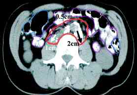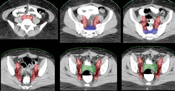 IMRT field (blue) surrounding the cervix cancer (red) and the involved lymph nodes (green) |