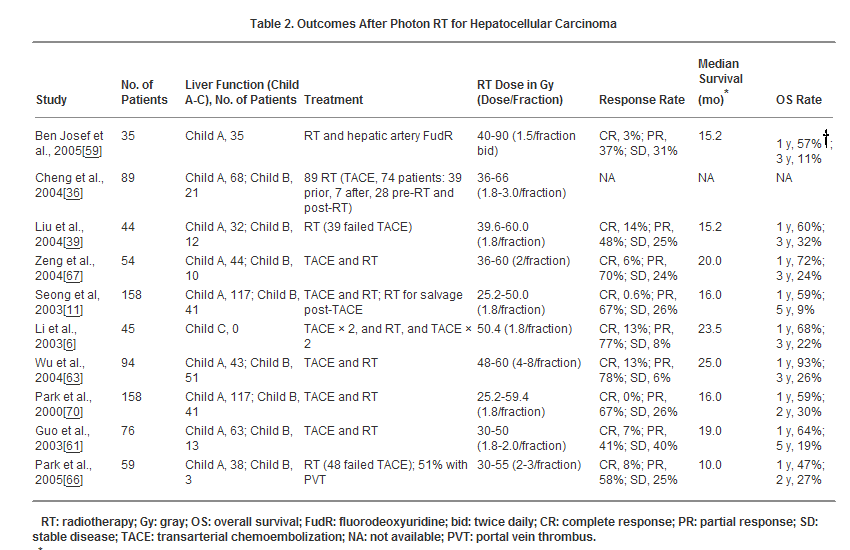 A systematic literature search was undertaken using the MEDLINE data base and secondary references to identify peer-reviewed, English-language articles that reported clinical outcomes after external beam RT alone or in combination with other treatments for HCC. Abstracts from the 2005 American Society of Clinical Oncology, American Society for Therapeutic Radiology and Oncology, American Gastrointestinal Association, and Society of Surgical Oncology Gastrointestinal Cancer Symposium also were included in the search. More than 60 articles reporting on clinical outcomes among patients who received RT for HCC have been published since 1990, including 20 articles that described unique sets of at least 15 patients. RT was used for palliation, to improve local control, and with curative intent in a wide spectrum of patients who most often were unsuitable for surgery and other treatments. Pain reduction following RT was noted in approximately 75% of patients with bone metastases from HCC who received RT. For patients with liver-confined disease treated with conformal RT, proton beam RT, and/or image guided RT with or without transarterial chemoembolization (TACE), local control response rates ranged from 40% to 90%, and the median survival ranges from 10 months to 25 months. For patients with HCC who had portal vein thrombus, the median survival after RT to treat the thrombus and/or the hepatic tumor with or without TACE ranged from 5.3 months to 9.7 months. Although outcomes after high-dose conformal RT for liver-confined HCC were excellent, the potential survival benefit of RT should be tested in randomized controlled trials that require international collaboration. |