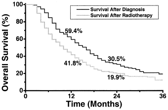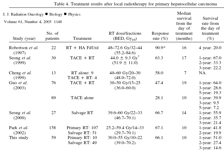 hepatocellular carcinoma. Park. IJROBP 2002;54:150 One hundred fifty-eight patients were enrolled in the present study between January 1992 and March 2000. The exclusion criteria included the presence of an extrahepatic metastasis, liver cirrhosis of Child class C, tumors occupying more than two-thirds of the entire liver, and a performance status on the Eastern Cooperative Oncology Group scale of more than 3. Radiotherapy was given to the field, including the tumor, with generous margin using 6- or 10-MV X-rays. The mean radiation dose was 48.2 ± 7.9 Gy in daily 1.8-Gy fractions. The tumor response was assessed based on diagnostic radiologic examinations, including a computed tomography scan, magnetic resonance imaging, and hepatic artery angiography 4–8 weeks after the completion of treatment. Liver toxicity and gastrointestinal complications were evaluated. Results: An objective response was observed in 106 of 158 (67.1%) patients. Statistical analysis revealed that the total dose was the most significant factor associated with the tumor response. The response rates in patients treated with doses <40 Gy, 40–50 Gy, and >50 Gy were 29.2%, 68.6%, and 77.1%, respectively. Survivals at 1 and 2 years after radiotherapy were 41.8% and 19.9%, respectively, with a median survival time of 10 months. The rate of liver toxicity according to the doses <40 Gy, 40–50 Gy, and >50 Gy was 4.2%, 5.9%, and 8.4%, respectively, and the rate of gastrointestinal complications was 4.2%, 9.9%, and 13.2%, respectively. |