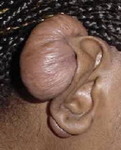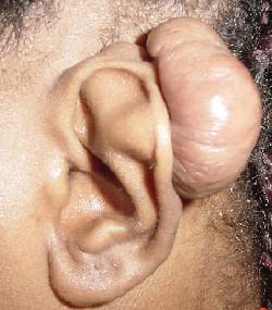 typical vaccination keloid | large deforming keloid on ear helix and small keloid on ear lobe |
