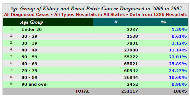 The median age for kidney cancer is 65 (64 for men and 66 for women)