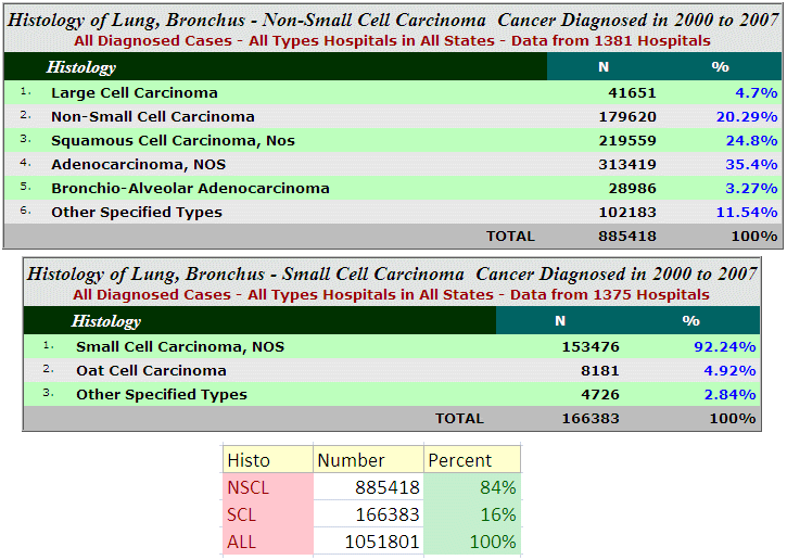 Most lung cancers are classified as non-small cell. Squamous cancer was the most common type in the mid 1900's but now adenocarcinoma is most common. Vaious theories have been proposed for the increase (go here). |