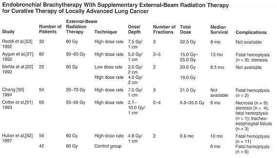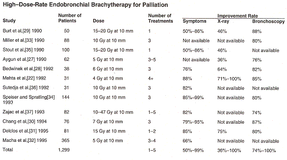 The use of high dose rate endobronchial brachytherapy to palliate symptomatic endobronchial recurrence of previously irradiated bronchogenic carcinoma.Bedwinek. Thirty-eight patients were treated with high dose rate endobronchial brachytherapy to palliate symptoms (cough, hemoptysis, fever, and/or shortness of breath) caused by endobronchial of previously irradiated (greater than or equal to 5000 cGy) bronchogenic carcinoma. The dose per fraction was 600 cGy at a radius of 1 cm from the center of the linear path of the source, and each patient received three fraction, each fraction separated by a 1-week interval. Twenty-nine patients (76%) had symptomatic improvement, 16 with complete and 13 with partial relief of symptoms.The median duration of symptom relief was 7.5 months. Repeat bronchoscopy done 3 months after brachytherapy revealed that 41% (11/27) had complete tumor regression and another 41% (11/27) had partial regression. Twelve patients (32%) died from massive hemoptysis occurring 2-56 weeks (median 10 weeks) after brachytherapy. Radiology 1996 Oct;201(1):279-82 Endobronchial brachytherapy with high-dose-rate remote afterloading for recurrent endobronchial lesions.Delclos. From 1988 to 1993, 81 patients with lung cancer previously treated with external beam radiation therapy were treated with palliative HDR endobronchial brachytherapy for symptoms due to relapse or persistent tumor of endobronchial bronchogenic origin. For most patients, Ir-192 was delivered in a dose of 3,000 cGy at 6 mm in two fractions over 2 weeks. RESULTS: Sixty-eight patients (84%) achieved some response: Twenty-six (32%) had excellent, 25 (31%) had moderate, and 17 (21%) had minimal symptomatic improvement with HDR endobronchial brachytherapy. The median duration of responses was 4.5 months. Those patients with an excellent response had a significantly better survival (13.3 months) compared with that of the other patients (5.4 months) (P = .01). There were two fatal complications, which were due to fistula and tracheal malacia. Int J Radiat Oncol Biol Phys 1992;23(2):397-400 High dose endobronchial irradiation in recurrent bronchogenic carcinoma.Gauwitz. 24 patients with endobronchial tumors that had recurred after external beam radiation therapy were treated with high dose rate intraluminal irradiation. A remote afterloading high dose rate unit was used, and most patients received two endobronchial treatments, separated by a two week interval. At each treatment, 15 Gy were delivered with dose specified at a radius of 6 mm from the center of the source, which corresponds to a dose of 9 Gy at a radius of 1 cm. Overall, 21 of 24 patients (88%) showed good symptomatic improvement. Of 18 patients whose chest x-ray showed evidence of collapse or atelectasis caused by tumor obstruction, 15 (83%) had evidence of reaeration. The median duration of palliation, marked by symptoms or a chest x-ray that worsened, was 26 weeks, the range varying from seven to 40 weeks. No patient died as a result of therapy and only one had a complication, bronchospasm, which responded well to bronchodilators. Thorax 1996 Apr;51(4):354-8 High dose rate brachytherapy for the local control of endobronchial carcinoma following external irradiation.Hernandez. A prospective cohort of 29 patients (19 men, mean age 65 years) underwent HDR brachytherapy for inoperable lung cancer. All patients had completed external irradiation at least one month before entry into the study dose 4400 cGy, completed 12.9 months previously. Patients underwent outpatient bronchoscopic placement of 1-3 HDR brachytherapy catheters for delivery of 750-1000 cGy of intraluminal irradiation every two weeks on 1-3 occasions. Positive response rates ranged from 25% for signs and symptoms related to pneumonitis to 69% for haemoptysis. Performance status improved in 24% of patients. Two patients died before completion of the study protocol. Short term complications included one episode of non-fatal, massive haemoptysis, five of minor haemoptysis, and one pneumothorax. Chest 1993 Oct;104(4):1006-11 High dose-rate intraluminal irradiation in bronchogenic carcinoma. Technique and results.Nori. In this series, we report on 80 high dose-rate endobronchial treatments in 32 patients who were treated with remote afterloading endobronchial irradiation. All patients had endoscopic and histologic proof of tumor. Patients were divided into two groups. Group 1 consisted of 17 patients who were treated with endobronchial brachytherapy as a boost to primary external-beam irradiation. The remaining 15 patients comprised group 2 and were treated for endobronchial recurrence after prior irradiation with an external beam (main dose, 5,000 cGy). The endobronchial irradiation treatments were delivered using a high dose-rate remote afterloader. The standard dose per fraction was 500 cGy prescribed at a distance of 1 cm from the central axis of the catheter for a median of 3 fractions at weekly intervals. Treatment length averaged 5 cm; the median total dose was 1,500 cGy. The median follow-up for the entire group was 9.3 months, with a range of 6 to 24 months. Symptomatic improvement was attained in 15 of 15 patients presenting with hemoptysis, in 6 of 7 of those with cough, and in 10 of 10 who presented with dyspnea. In ten patients, follow-up endoscopy was performed, which revealed a pathologic complete response (by negative results on biopsies). At 6 months past the last brachytherapy, clinical and radiographic local control was obtained in 15/17 (88 percent) of the patients in group 1 and in 70 percent of the patients in group 2. All patients tolerated treatment well, without any acute or late complications, and there were no instances of fistula formation or fatal pulmonary hemorrhage. Lung Cancer 1997 Mar;16(2-3):203-13 Defining the roles of high dose rate endobronchial brachytherapy and laser resection for recurrent bronchial malignancy.Ornadel. We have undertaken a prospective analysi