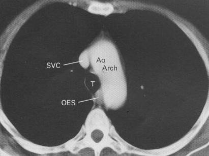 oesophagus, RIV = right innominate vein, RPA = right pulmonary artery, SVC = superior vena