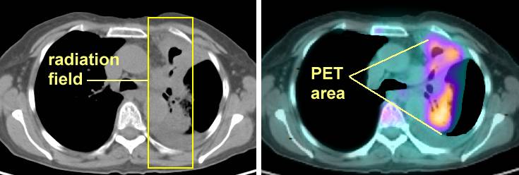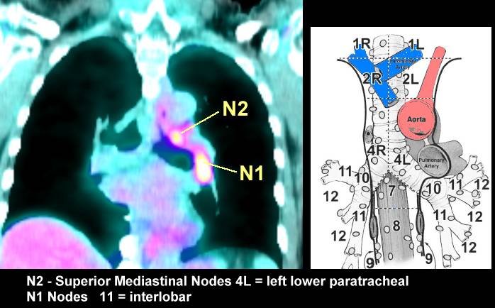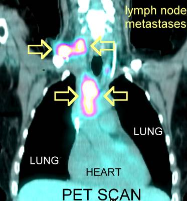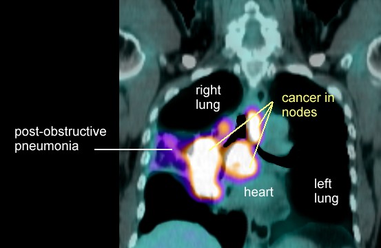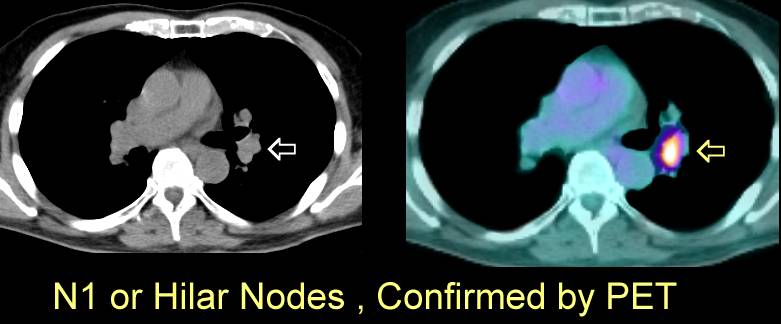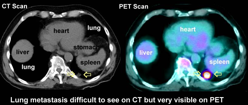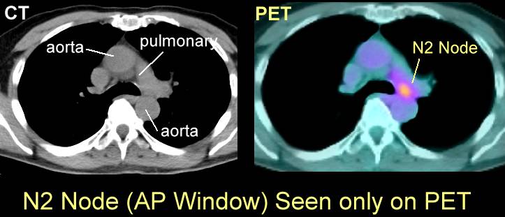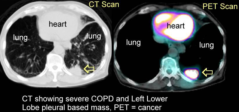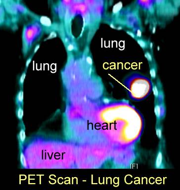 PET scans have been shown to be superior to CT scans in evaluating lung cancer (go here). PET scans: here ,here , here , here, here , here and more PET Scans PET showing lymph node spread here, and a PET is much better than a CT in determining if the lymph nodes are cancerous see here , here , here and here CT of nodes here, Pet can separate cancer from pneumonia (go here) and can distinguish between cancer and collapsed lung (here , here and here) The PET will which parts of the tumor has active or growing cells (called hypermatabolic because they are using more glucose than normal cells) and which parts of the cancer may be no longer growing or even dying off (called necrotic) from lack of oxygen due to out growing their blood supply (see here) More comparisons showing PET superior to CT here , here, here , here and here |