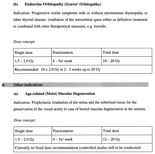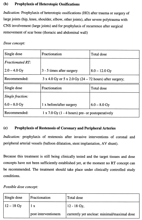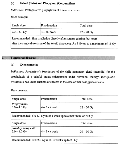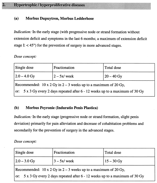 therapy of benign diseases: a multicenter approach in GERMANY Mocke. IJROBP 2002;52:496 General indications for RT The potential clinical indications for RT of benign diseases are various, and an interdisciplinary agreement has not always been coordinated. A unified definition of RT indications, with the issue of RT of benign diseases addressed specifically, does not exist . In German-speaking countries and in central and Eastern European regions, the following indications are currently known): 1. Acute/chronic inflammatory disorders, e.g., axillary sweat gland abscess, furuncula, carbuncula, panaritium, and other infections not responding to antibiotics, etc.; 2. Acute/chronic painful degenerative diseases, e.g., insertion tendinitis and chronic or acute painful osteoarthritic diseases of various joints (hip, knee, etc.); 3. Hypertrophic (hyperproliferative) disorders of soft tissues, e.g., prophylactic RT in early stages of Morbus Dupuytren and Ledderhose, and Morbus Peyronie (Induratio penis plastica), postoperative prophylaxis of recurrence for keloids and pterygium; 4. Functional diseases, such as Graves orbitopathy, arteriovenous malformations, age-related macular degeneration, persisting lymphatic fistula; 5. Other indications, such as prophylaxis of heterotopic ossification at various joints, prophylaxis of neointimal hyperplasia, e.g., after arterial dilatation or stent implantation, obstruction of hemangiomas and other vascular disorders of various organs; 6. Dermatologic diseases, e.g., pruritus due to itching dermatoses and eczemas, inaccessible psoriatic focuses (e.g., subungual focuses), basalioma. Dose protocols: #1, #2, #3, #4, #5 Radiotherapy of hidradenitis suppurativa--still valid today? (see review article about this disease here, and here and here) Frohlich D, Strahlenther Onkol. 2000 Jun;176(6):286-9. PURPOSE: In a retrospective analysis the efficacy of radiotherapy in the treatment of hidradenitis suppurativa was assessed. PATIENTS AND METHODS: Data from 231 patients undergoing radiotherapy for hidradenitis suppurativa in the last years in 2 hospitals were analyzed. The patients were treated with an orthovoltage therapy unit with 175 kV, 0.5 mm copper-filtering. The single doses reached from 0.5 Gy to 1.5 Gy up to total doses between 3.0 Gy and 8.0 Gy in one series. In chronic recurrent disease 2 or more series with a total dose of more than 10.0 Gy were given. RESULTS: Complete relief of symptoms at the end of radiotherapy was achieved in 89 patients (38%). In 92 patients (40%) there was clear improvement of symptoms. Only 2 patients did not react to radiotherapy. No side effects of radiotherapy occurred. CONCLUSION: Radiotherapy should be given more consideration as a treatment option for hidradenitis suppurativa. Therapeutic effects of low radiation