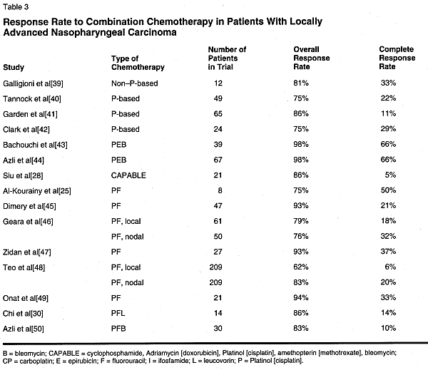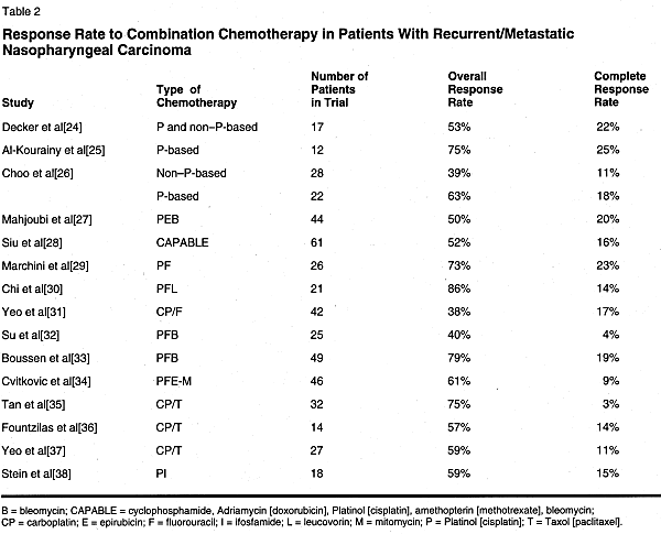 Chemotherapy in Advanced Nasopharyngeal CancerChemotherapy is an integral part of treatment for patients with nasopharyngeal carcinoma. Chemotherapy can achieve long-term survival rates of up to 15% to 20%, even in patients with recurrent or metastatic disease. In the majority of studies reported, patients with previously untreated locally advanced stage III and IV nasopharyngeal carcinoma showed improved local control, decreased systemic metastasis, and improved disease-free and overall survival when treated with cisplatin (Platinol)-based combination chemotherapy in conjunction with radiotherapy. In prospective, randomized, phase III trials, concurrent chemoradiotherapy, followed by adjuvant chemotherapy, significantly improved local control, systemic control, and progression-free and overall survival. The authors believe that different sequences of treatment modalities and newer chemotherapy agents need to be investigated in the future. [ONCOLOGY 14(8):1223-1230, 2000] IntroductionNasopharyngeal carcinoma is a malignant tumor with unique features that make it pathologically, epidemiologically, and clinically distinct from other head and neck cancers. There is no clear association with tobacco or alcohol use in most cases of nasopharyngeal cancer (World Health Organization [WHO] grades II and III). Patients with nasopharyngeal carcinoma have a higher incidence of nodal involvement and bilateral nodal disease at presentation, and overall (80% to 90%) nodal metastasis, as compared with patients with other malignancies of the head and neck. In addition, patients with nasopharyngeal carcinoma have a higher overall incidence of systemic metastasis than patients with tumors in other head and neck sites. In the United States and Europe, the incidence of nasopharyngeal cancer ranges from 0.5 to 2 cases per 100,000 people.[1] In some areas of the world, namely, southern China, Southeast Asia, North Africa, the Middle East, Alaska, and Greenland,[1-5] nasopharyngeal cancer is more common. In these areas, incidence may be as high as 25 to 50 per 100,000 people,[2] and the pathology is mostly of the undifferentiated variety. The Epstein-Barr virus is more strongly associated with nasopharyngeal carcinoma in areas of higher prevalence and in patients whose tumors are WHO grades II and III than in less aggressive grades and in areas of lower incidence. Nasopharyngeal carcinoma affects men more often than women, with a male-to-female ratio of 33.5:1.[1,6] The incidence of the disease begins to rise at age 20 years and starts to decline at age 60 years, with a median age of incidence of 40 to 50 years. Treatment OverviewNasopharyngeal carcinomas respond to radiation therapy (Table 1) as well as chemotherapy (Tables 2and 3 Because nasopharyngeal cancer responds so well to radiotherapy, and in light of the sensitive location of the primary disease and the often advanced stage at presentation, surgery is often unnecessary or impractical. However, for persistent or recurrent disease in regional nodes, surgery is the treatment of choice in most cases. Radiotherapy has been the traditional, standard form of therapy for all patients with local and locoregional disease. Marcial et al[12] reported complete local clearance of nasopharyngeal carcinoma in 96% of patients with T1 disease treated with radiotherapy, 88% of those with T2, 81% of those with T3, and 74% of those with T4. Complete clearance rates in patients with N1-3 disease who received irradiation ranged from 93% to 71%. The 5-year survival rate of these patients with nodal involvement was only 40%; overall 5-year survival rates of patients with all stages of nasopharyngeal carcinoma treated with radiotherapy, reported by various investigators from all over the world, have ranged from 24% to 62% (Table 1). Qin et al[18] reviewed the survival rates of 1,379 patients with advanced nasopharyngeal carcinoma treated with radiotherapy. The majority of patients had either stage III (n = 417) or stage IV cancer (n = 647). These investigators reported that the 5, 10-, and 20-year survival rates of patients with stage III cancers treated with radiotherapy alone were 46%, 29%, and 17%, respectively. The 5-, 10-, and 20-year survival rates of stage IV patients treated with irradiation were 29%, 21%, and 8%, respectively. Overall, the 5-year survival rate of nasopharyngeal carcinoma patients with stage IV disease treated with radiotherapy alone was less than 30%, regardless of country of origin or histopathology. Locoregional recurrences occur in 40% to 80% of patients, and distant recurrences in 15% to 50% of patients. The usual radiation dose is 65 to 75 Gy in 1.8- to 2.0-Gy fractions, 5 days a week. This dose is crucial for achieving complete locoregional control and 5-year survival.[18] In a nonrandomized trial reported by Wang,[51] the local control rate improved significantly with accelerated hyperfractionated radiotherapy, as compared with once-daily radiotherapy. The improved local control rates occurred in patients with N2-3 disease and among both males and females. Despite the high initial response rate and good local control achieved with radiotherapy in patients with locally advanced stage III and IV nasopharyngeal carcinoma, the 5- and 10-year survival rates were poor and unacceptable. Options for patients who experience local and/or regional failure include reirradiation and, occasionally, surgical resection; the latter is especially appropriate for patients with involvement of regional lymph nodes only.[52] The majority of patients with recurrent disease, and all patients with metastatic disease, should be treated with systemic chemotherapy for palliation. ChemotherapyNasopharyngeal carcinomas are highly sensitive to chemotherapy (Tables 2 and 3). Single agents identified as being active in this disease include methotrexate, bleomycin (Blenoxane), doxorubicin, cisplatin (Platinol), carboplatin (Paraplatin), and, more recently, paclitaxel (Taxol), a