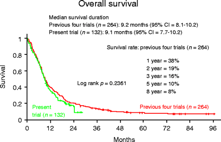 Results. Thirty-three (30%) of 111 assessable patients (95% confidence interval 27%33%) had objective responses to treatment (26 partial responses, seven complete responses). The combination of gemcitabine and irinotecan was associated with significantly less toxicity than the triple-drug regimen and improved the responses in several patients (10%). The response rates were similar in the two major histologic tumor types, but were lower for patients with liver-dominant tumors (13%) and higher for patients with lymph-node-dominant tumors (50%). The median progression-free survival time, median survival time, and actuarial survival rates at 1 and 2 years were 5.7 months, 9.1 months, 35%, and 16%, respectively.