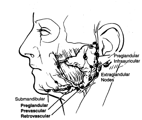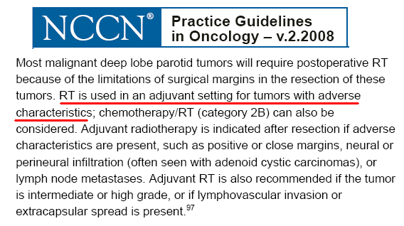 go here. See survival related to histologic type. ( Best Web Sites for Parotid Gland Cancer: see the NCI physician site or the NCI patient site, NCCN dose , flow chart and postOp indications, CancerNet, ACS, E-Medicine here and here, also patients with squamous skin cancers that spread to the parotid nodes need postOp radiation (see NCCN.)