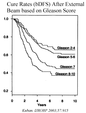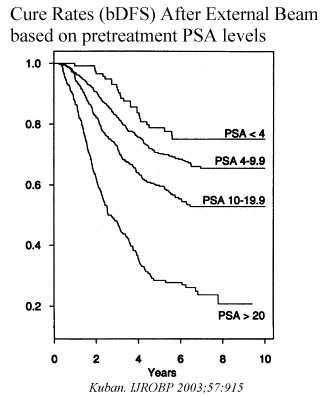 starts to rise after receiving radiation?" Recently published data from 6 Universities on 1,765 men treated with external beam irradiation showed the following cure rates (defined as normal and stable PSA at 5 years) from Shipley JAMA 1999;281:1598. An update in 2003 based on 4,839 patients showed similar results based on the PSA level and the Gleason Score |
