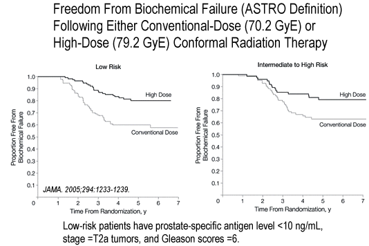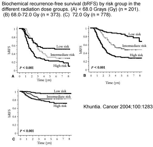 Similarly, the proper dose of radiation is still unsettled. In the past doses in the range of 6000 to 6600 where considered as high as safe. With 3D conformal therapy or IMRT it is possible to use higher doses safely (well over 7200cGy) and with apparent benefit (at least in high risk patients with PSA > 10) as noted below. (see data here.) (see NCCN guidelines.) |