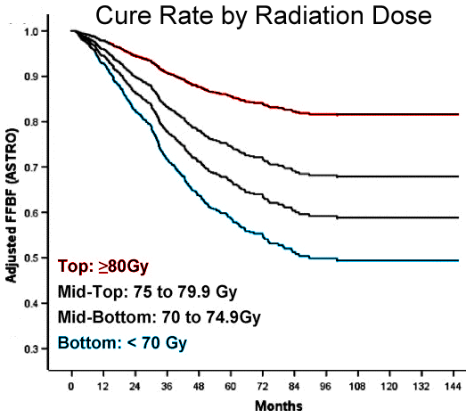 What Dose of External-Beam Radiation is High Enough for Prostate Cancer?Eade.Hanks IJROBP 2007;68:682 The study cohort consisted of 1,530 men treated with three-dimensional conformal external-beam radiotherapy between 1989 and 2002. Patients were divided into four isocenter dose groups: <70 Gy (n = 43), 70–74.9 Gy (n = 552), 75–79.9 Gy (n = 568), and ≥80 Gy (n = 367). Radiotherapy dose was significant in multivariate analyses for FFBF (ASTRO and Phoenix) and FFDM. Adjusted 5-year estimates of ASTRO FFBF for the four dose groups were 60%, 68%, 76%, and 84%. Adjusted 5-year Phoenix FFBFs for the four dose groups were 70%, 81%, 83%, and 89%. Adjusted 5-year and 10-year estimates of FFDM for the four dose groups were 96% and 93%, 97% and 93%, 99% and 95%, and 98% and 96%. Dose–response functions showed an increasing benefit for doses ≥80 Gy. Conclusions: Doses of ≥80 Gy are recommended for most men with prostate cancer. |