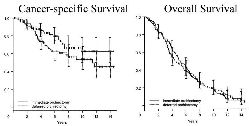 Immediate Versus Deferred Hormonal Treatment for Patients With Prostate Cancer Who Are Not Suitable for Curative Local Treatment: Results of the Randomized Trial SAKK 08/88Hormonal therapy for prostate cancer has been used for more than 60 years in patients who are not candidates for definitive treatment with curative intent. Although there is general agreement that it delays disease progression and is effective for palliation of symptoms, controversy exists about when it should be initiated and whether it prolongs survival. Advocates of early hormonal treatment note that delay in progression translates into reduction of symptoms and prolonged survival. Proponents of delayed treatment claim that if patients are observed closely, treatment can be initiated before severe symptoms or complications develop, and that they are spared the adverse effects of hormonal therapy for long periods and, indeed, some may never need it. They also cite studies showing no survival advantage with early treatment. We evaluated the timing of hormonal therapy with immediate or deferred subcapsular orchiectomy to determine whether there is a significant difference in overall survival, symptom-free survival, or incidence of complications. To determine if immediate hormonal therapy is advantageous compared with deferred treatment in newly diagnosed asymptomatic prostate cancer patients who, for any reason, were not candidates for curative local treatment. Between February 1988 and February 1992, 197 patients with a median age of 76 years (range, 56 to 86 years) were randomly assigned to receive either immediate or deferred orchiectomy on symptomatic progression. The two groups did not differ significantly in clinical or laboratory parameters; 67% had T3-4 tumors and 20% had lymph node metastases. Patient accrual was stopped prematurely because of a similar competing trial. Therefore, observation time was prolonged to achieve the desired number of events and statistical power. RESULTS: Deferred orchiectomy was necessary in 58% of the patients. Median time to disease progression was 2.8 years less than for patients with immediate orchiectomy. However, overall pain-free time from random assignment to symptomatic progression after immediate or deferred orchiectomy, and performance status, were identical in both groups. Cancer-specific survival tended to be longer in the immediate group (P = .09) but there was no difference in overall survival between the two groups (P = .96). The median hemoglobin value decreased significantly after immediate orchiectomy (P < .001). CONCLUSION: For elderly, asymptomatic patients not undergoing curative local treatment, we were unable to show any major advantage of immediate compared with deferred hormonal treatment regarding quality of life or overall survival in our limited number of patients. Disabling complications were prevented in the deferred-treatment arm by careful follow-up; 42% of these patients never required any tumor-specific treatment. |