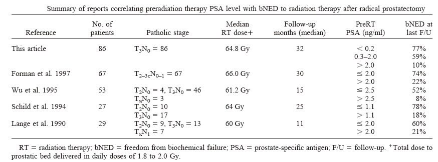 Abstract Purpose: The appropriate radiation dose has not been determined for postoperative radiation therapy (RT) of prostate cancer. Postoperative PSA level is a useful marker of local residual disease, and may allow evaluation of RT dose–response after radical prostatectomy. Methods and Materials: Between 1989 and 1996, 86 consecutive patients with pT3N0 prostate cancer who did not receive prior hormonal therapy or chemotherapy were irradiated postoperatively. All patients received 55.8 to 70.2 Gy (median = 64.8 Gy) to the prostatic/seminal vesicle bed. Patients were judged to be free of biochemical failure (bNED) if their PSA remained undetectable or decreased to undetectable level (< 0.2 ng/ml). The median follow-up time was 32 months from time of irradiation. Results: Univariate and multivariate analyses of variables showed that the preRT PSA level was the most significant predictor of improved bNED survival (p < 0.001). Actuarial analyses of radiation dose grouped with preRT PSA levels found higher radiation dose to be significant (p < 0.05). For the 52 patients with an undetectable preRT PSA level, the 3-year bNED rate was 91% for patients irradiated to 61.5 Gy or more and 57% for those irradiated to lower doses (p = 0.01). For the 21 patients with preRT PSA level > 0.2 and ≤ 2.0 ng/ml, the 3-year bNED rate was 79% for patients irradiated to 64.8 Gy or more and 33% for those irradiated to a lower dose (p = 0.02). No other preRT PSA interval or radiation dose level was associated with a dose–response function. Conclusion: In patients with pT3N0 prostate cancer after radical prostatectomy, a radiation dose–response function may be present and depends on the preRT PSA value. Patients with high postoperative PSA levels (> 2.0 ng/ml) may be less likely to benefit from higher doses of RT, and should be considered a group for which systemic therapy should be tested. |