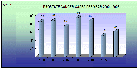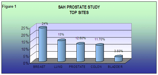INTRODUCTION Prostate cancer is the most common cancer in men in the U.S. with a lifetime risk of 17.1%. Prostate cancer accounts for 16% of all cancers and 33% of all cancers in men. It is the third most common cancer seen at St. Anthony’s Hospital (SAH), accounting for 12.6% of all cases in the Cancer Registry (Figure 1). The Cancer Committee reviewed 538 analytic cases for the study period from 2000 through 2006. A slight declined in 2005 & 2006 data, was thought to be related to referral patterns. (Figure 2).