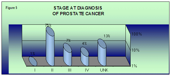 STAGE AT DIAGNOSIS More of our patients (75%) were diagnosed in Stage II disease than any other stage (Figure 5). This reflects earlier detection, through PSA screening and examination. Men diagnosed with early-stage prostate cancer should be counseled about treatment options and issues related to morbidity and quality of life, as per the guidelines from the NCI and the NCCN .
