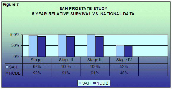 SURVIVAL Analysis of the 5-year relative survival of prostate cancer patients for all stages reveals a survival rate of 100%. With the widespread use of PSA screening, this cancer is almost always diagnosed at the earliest stages (Figure 7).