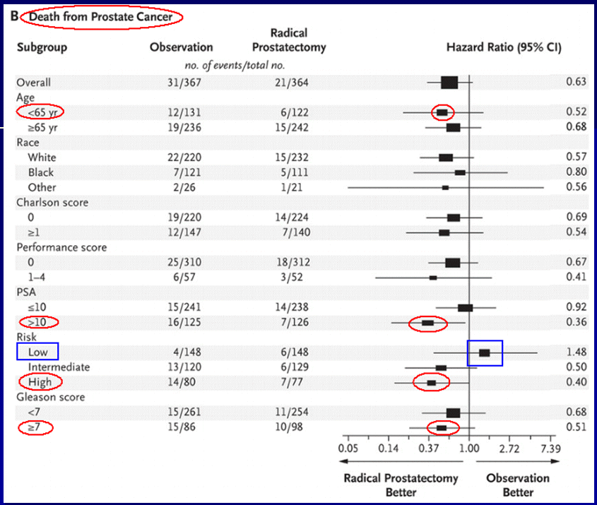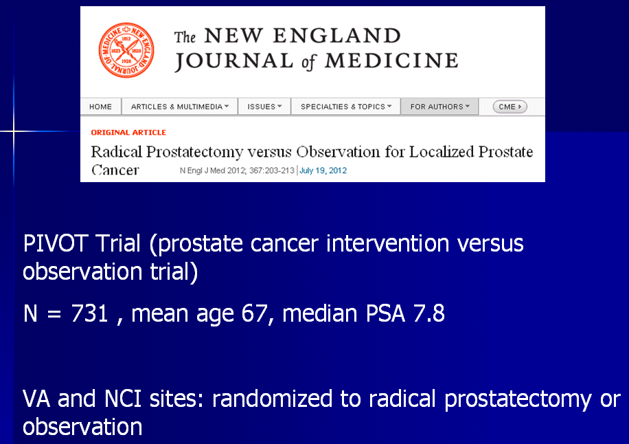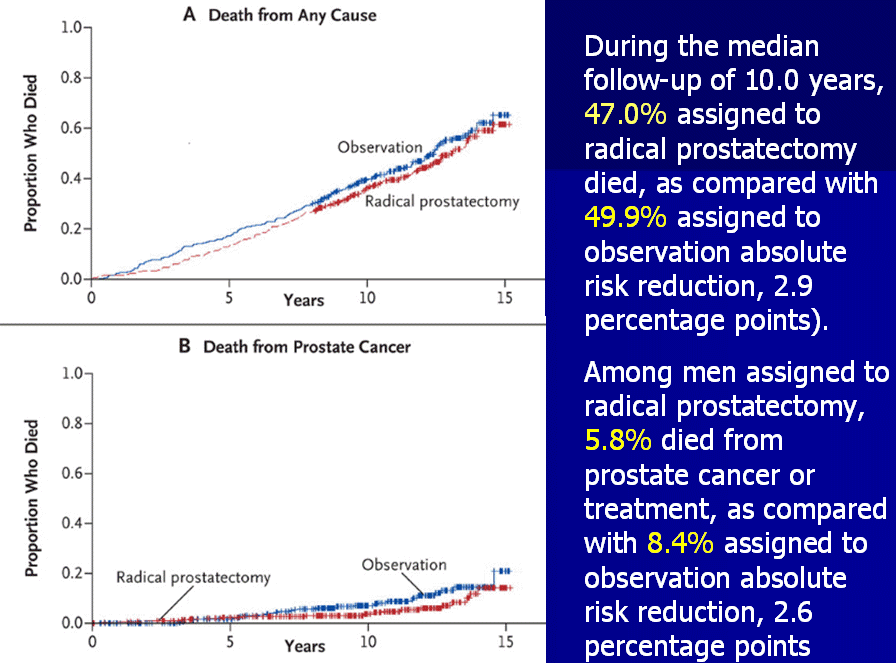 In 2007 the American Urological Association published new guidelines which basically said that the results with external beam or seeds or surgery were the same (go here). In 2012 the PIVOT trial showed that a radical prostatectomy only improves survival by 2 to 3% over no treatment at all, again raising the option of 'watchful waiting' (page 1, page 2, page 3) The technology with IMRT has become so good that IMRT may be the best treatment (go here). For a recent review on modern radiation and prostate cancer go here. |