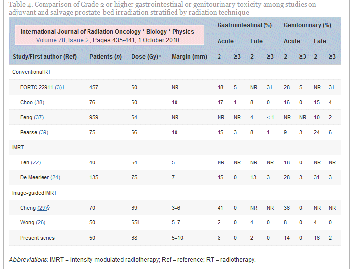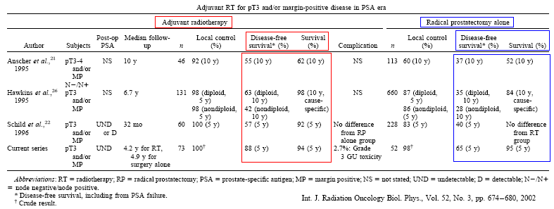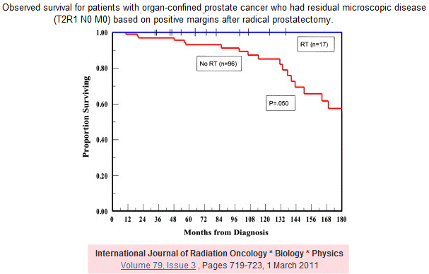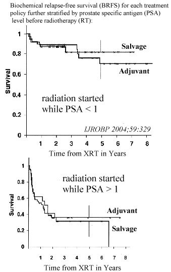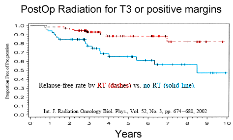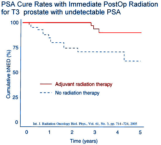 There is debate as to whether radiation should begin immediately for all T3 lesions or whether to wait until the PSA starts to rise or at least stays elevated (salvage radiation.) In general immediate PostOp radiation has better results than waiting and attempting salvage. In general routine postOp (adjuvant radiation) cures about 70% of the men, but salvage radiation (waiting till the PSA is clearly rising) cures about 50%. So in general adjuvant may be better than salvage but as long as the man is treated before the PSA gets too high the results are probably the same (see study by Hagan) and data below and on the salvage page. |